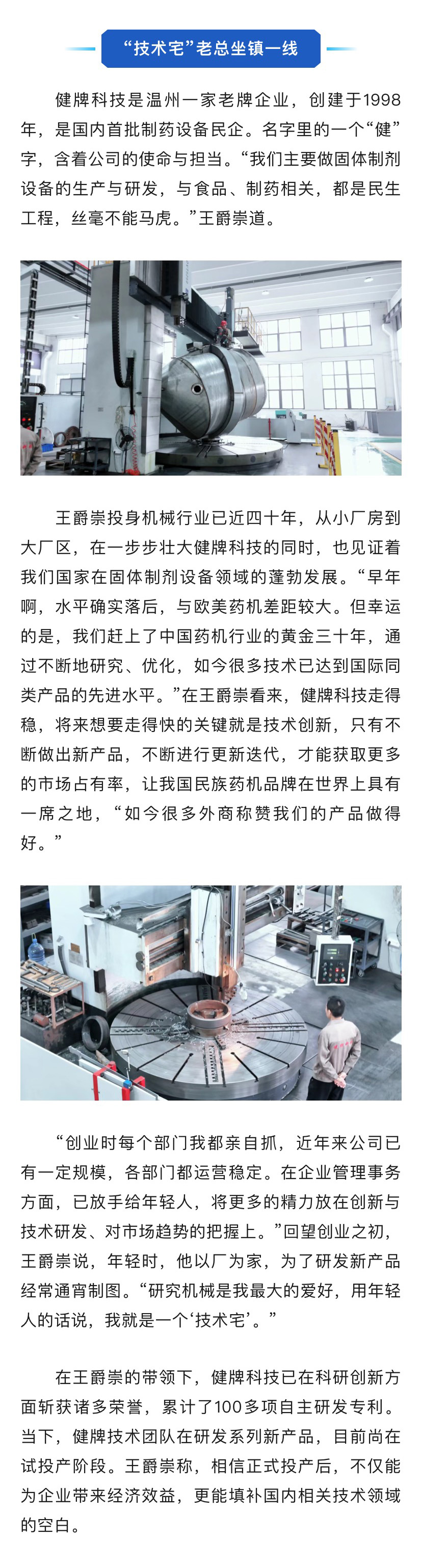 浙江健牌機(jī)械科技有限公司創(chuàng)建于一九九七年,為專業(yè)制造研發(fā)食品制藥設(shè)備、新能源設(shè)備的供應(yīng)商。高新技術(shù)企業(yè),火炬計(jì)劃項(xiàng)目承擔(dān)單位、省專精特新企業(yè)。中國制藥裝備行業(yè)協(xié)會會員單位,中國醫(yī)藥設(shè)計(jì)協(xié)會理事單位。健牌技術(shù)力量雄厚,加工和檢測設(shè)備齊全,生產(chǎn)均嚴(yán)格按照國家GMP規(guī)范執(zhí)行,研發(fā)的制藥機(jī)械設(shè)備的技術(shù)性能與質(zhì)量水平均達(dá)到先進(jìn)水平。
